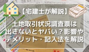 土地取引状況調査票を出さない人「土地取引状況調査票が届いたけど、出さないとダメなの?無視したらどうなるの?」 土地を購入した後に「土地取引状況調査票」が突然届いて戸惑う方も多いので … 続きを読む 土地取引状況調査票は出さないとヤバい?影響やデメリット・記入法を解説